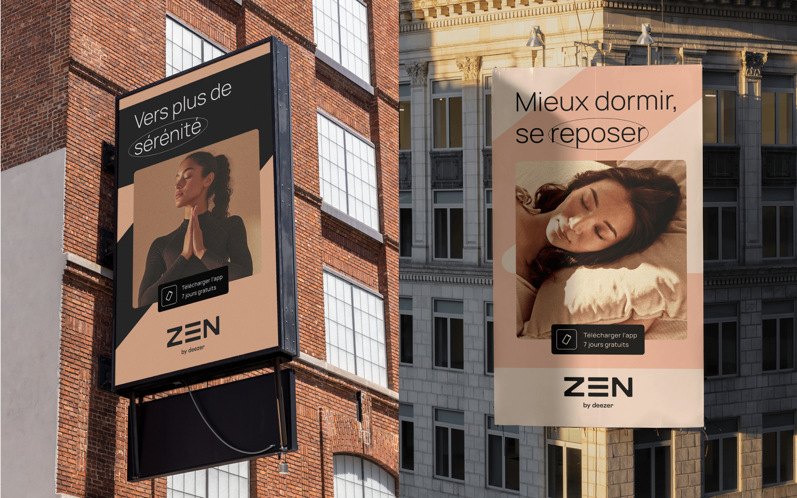 __A TRANSFORMATIVE WELLNESS EXPERIENCE ZEN, DEEZER’S WELLNESS APP, REACHED US TO LEAD A STRATEGIC REBRANDING AND ART DIRECTION INITIATIVE AIMED AT ELEVATING THE PLATFORM’S EMOTIONAL AND AESTHETIC RESONANCE. BY BLENDING MINIMALIST DESIGN WITH WARM, HUMAN-FOCUSED VISUALS, WE CRAFTED A BRAND EXPERIENCE THAT BRIDGES THE GAP BETWEEN SLEEK TECHNOLOGY AND PERSONAL WELL-BEING. THE REIMAGINED IDENTITY—ANCHORED IN A REFINED PALETTE OF LIGHT DARK CONTRASTS AND SKIN-INSPIRED TONES—SUPPORTED ZEN’S AMBITIOUS GOALS: TO INCREASE NEW USER ACQUISITION BY 30% AND IMPROVE BRAND PERCEPTION BY 76% WITHIN ITS TARGET AUDIENCE. THE RESULT, AN EMOTIONALLY INTELLIGENT DESIGN SYSTEM AND USER-FRIENDLY INTERFACE, POSITIONING THE PLATFORM AS A STANDOUT IN THE MINDFULNESS AND WELLNESS SPACE—STRENGTHENING DEEZER’S PRESENCE IN DIGITAL HEALTH__